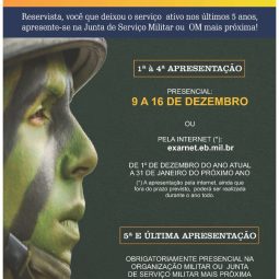 O Exército Brasileiro está convocando os reservistas que deixaram o serviço ativo nos últimos cinco anos para participarem do Exercício de Apresentação da Reserva (EXAR). A apresentação pode ser realizada presencialmente ou pela internet, conforme o período estabelecido.